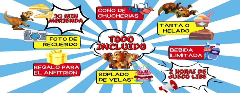 INCLUYE: 2 Horas de juego libre, 30 min merienda, soplado de velas, reparto de regalos, foto de recuerdo, regalo para el anfitrión y una bolsa de chucherías para cada invitado.